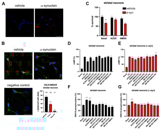 Expression and functionality of CB1R-NMDAR complexes in striatal neurons treated with α-syn fibrils. (A) Primary cultures of rat striatal neurons were treated with α-syn or vehicle. α-syn fibrils were detected by immunocytochemistry with a mouse anti-human α-synuclein antibody (red). Nuclei were stained with Hoechst (blue). Scale bar: 30 µm. (B) Proximity Ligation Assay (PLA) was performed in primary cultures of rat striatal neurons treated or not with α-syn fibrils. Confocal microscopy images are shown (superimposed sections) in which heteromers appear as red clusters. Neurons were labeled using a mouse anti-MAP2 antibody (green). Cell nuclei were stained with Hoechst (blue). Scale bar: 30 μm. Quantification of the number of red dots/cells with dots (r) and of the percentage of cells presenting red dots is shown. Values are the mean ± SEM (n = 6). One-way ANOVA, followed by Tukey’s multiple comparison post hoc test, was used for statistical analysis (*** p < 0.001, versus vehicle). (C) Primary cultures of rat striatal neurons were treated with α-syn or vehicle for 24 h, followed by treatment with ACEA (100 nM) or NMDA (15 mM) or vehicle for another 24 h period. Then, cells were gently detached, and neuronal survival was assessed with a cell counter. Values are the mean ± SEM of 5 independent experiments performed in triplicates. Two-way ANOVA, followed by Tukey’s multiple comparison post hoc test, was used for statistical analysis (* p < 0.05, versus vehicle condition). (D–G) Primary cultures of rat striatal neurons treated (E,G) or not (D,F) with α-syn were stimulated with the selective antagonists (1 µM SR141617 for CB1R or 1 µM MK-801 for NMDAR), followed by agonist stimulation (100 nM ACEA for CB1R and/or 15 µM NMDA for NMDAR) and cAMP levels (D,E), and MAPK phosphorylation signals were measured (F,G). Values are the mean ± SEM of 6 different experiments. One-way ANOVA, followed by Tukey’s multiple comparison post hoc test, were used for statistical analysis (* p < 0.05, *** p < 0.001; versus forskolin in cAMP assay or versus basal in MAPK phosphorylation).