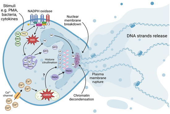 Taken together, stimulated neutrophils generate H2O2 via oxidative bursts, which mediates the NE release from granules in an MPO-dependent manner. NE can degrade cellular actin and enter into the nucleus to cleave histones, promoting chromatin decondensation. In this context, MPO enhances NE release from granules and its translocation into the nucleus to facilitate chromatin decondensation and the release of NETs [60,78].