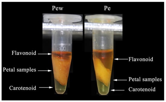 Identification of the petal pigment. Flavonoids are located in the upper layer, carotenoids are located in the lower layer, and the middle layer is the petal sample. Pew, outer petal; Pe, inner petal.
