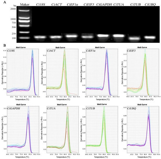 Performance of the amplification primers. (A) Amplification products obtained via qRT-PCR. (B) Melting curves of candidate genes.