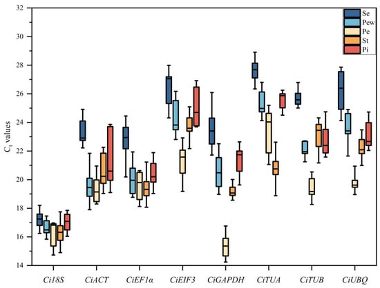 The threshold cycle (Ct) value is indicative of the gene expression levels in samples. In the floral organs of C. impressinervis, the Ct values of the candidate genes ranged from 14.242 to 28.914 (Figure 3). Within the inner petals, the lowest mean Ct value was observed for CiGAPDH (15.38), and the highest for CiTUA (23.05). Conversely, in the outer petals, pistils, and sepals, the lowest mean Ct value was recorded for Ci18S (16.66, 16.96, and 17.24, respectively), and the highest for CiTUA (25.00, 25.46, and 27.23, respectively). In the stamens, the lowest average Ct value was for Ci18S (16.33), while the highest was for CiEIF3 (23.70). These results indicate a relatively high expression abundance of Ci18S and a low expression abundance of CiTUA across the floral tissues. Furthermore, the coefficient of variation for Ci18S was relatively low in the sepals, outer petals, and pistils, suggesting minimal fluctuation and preliminary evidence of its stability (Table 3). In contrast, CiACT exhibited the highest coefficient of variation in both outer petals and pistils, indicating a broad range of Ct value fluctuations and thus poor stability (Table 3).
