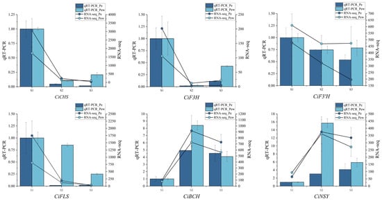 This study utilized CiTUB as the internal reference gene to analyze the expression patterns of six genes implicated in the formation of flower color in C. impressinervis. There are four genes (CiCHS, CiF3H, CiF3′H, and CiFLS) associated with the flavonoid biosynthesis pathway and two genes (CiBCH and CiNS) associated with the carotenoid biosynthesis pathway. qRT-PCR analysis revealed that the relative expression levels of genes such as CiCHS, CiF3H, and CiFLS were highest during the S1 stage and generally exhibited a decreasing trend in later stages (Figure 5). The relative expression levels of CiBCH and CiNSY peaked in the S2 stage, showing an initial increase followed by a decrease. The expression trends of these six color-related genes in qRT-PCR analysis were consistent with those in transcriptome expression data, validating the reliability of CiTUB as a reference gene.