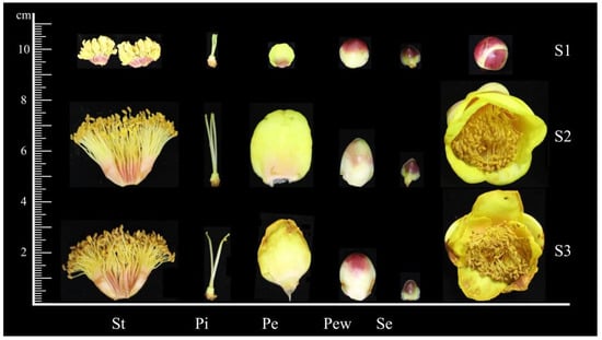 C. impressinervis was selected as the experimental material and cultivated at Lingtou Oil Tea Farm, Jin’an District, Fuzhou City, Fujian Province, China, since 2014. Samples were collected in March 2022. Based on the flowering stages of C. impressinervis (Figure 6), the developmental cycle was categorized into three distinct periods: young stage (S1), blooming stage (S2), and decay stage (S3). The collected samples were segregated into five parts: outer petal (Pew), inner petal (Pe), sepal (Se), pistil (Pi), and stamen (St). Post-collection, samples were immediately placed in 5 mL sterile, enzyme-free centrifuge tubes and snap-frozen in liquid nitrogen. Three biological replicates were taken from each sample and stored at −80 °C for further analysis.
