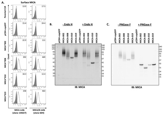 Analysis of MICA allele expression. (A). Three independent FACS analyses of surface expression levels of MICA alleles with APC-conjugated anti-MICA (clone 159227, left row panels) or anti-MICA/B (clone 6D4, right row panels) monoclonal antibodies (mAbs). Anti-MICA mAb (clone 159227, R&D, FAB1300A-100) detected a low level of cell surface MICA*002 in small percentage of cells, while anti-MICA/B mAb (clone 6D4, BioLegend, 320907) detected MICA*002 in majority of cells. Both mAbs detected MICA*008 and MICA*019 with similar capacity, while they failed to detect the expression of MICA*010 on cell surface. (B). Western blot analysis of MICA allele proteins treated by Endo H. The total lysates from C1R cells expressing vector pCDH-copGFP, MICA*002, MICA*008, MICA*010, or MICA*019 were untreated (−Endo H) or treated with Endo H (+Endo H) before immunoblot with anti-MICA antibodies, as described in “Materials and Methods”. Endo H treatment led to a significant decrease in MICA*010’s molecular weight, while the treatment did not cause molecular weight changes in most MICA*002, MICA*008, and MICA*019 proteins. (C). Western blot analysis of MICA alleles treated with PNGase F. PNGase F treatment led to similar molecular weights for MICA*002, MICA*010, and MICA*019. MICA*008 without transmembrane segment and cytoplasmic domain had a smaller molecular weight than other MICA alleles after PNGase F treatment. Both Western blots (B,C) are representatives of two independent experiments.
