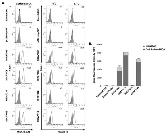 LCL stable cell lines expressing vector control, MICA*002, MICA*008, MICA*010, and MICA*019 were incubated with recombinant human NKG2D-Fc fusion protein (R&D) at 4 °C or 37 °C, followed by staining with APC-conjugated anti-human IgG Fc. MICA surface expression was monitored by staining with anti-MICA/B (6D4, Biolegend) at 4 °C for 30 min, as described above. The binding capacity of rhNKG2D-Fc to MICA alleles was analyzed by EC800 Flow Cytometry Analyzer (Sony Biotechnology).