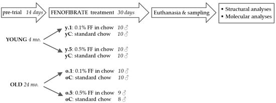 Experimental design in the study: In separate experiments, young and old rats were fed either 0.1% or 0.5% (w/w) fenofibrate, mixed into chow before pelleting, while control groups received the same chow without the drug. After 30 days, the animals were sacrificed and tissues were collected for subsequent structural and molecular analyses. The control groups for rats of either age were combined after checking that there were no significant differences between them. FF, fenofibrate; y.1, o.1—young or old rats treated with 0.1% fenofibrate; y.5, o.5—young or old rats treated with 0.5% fenofibrate; yC, oC—young or old control groups.