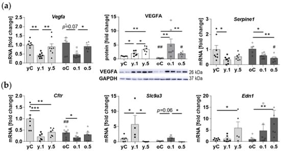 Verification of the results of the PCR array revealed some interesting observations regarding the expression levels of the genes related to hypoxia and osmotic stress. Vascular Endothelial Growth Factor A (VEGFA), produced in the kidney predominantly by podocytes, plays vital roles for glomerular endothelial cells’ and podocytes’ physiological functions []. The mRNA levels of Vegfa in the rat kidney were altered by both doses of FF in a similar manner: the levels in control animals did not differ between age groups, whereas 0.1% FF decreased, and 0.5% FF returned Vegfa expression to the control values (Figure 5a). This pattern of response was challenged at the protein level since the lower FF dose increased VEGF expression in both age groups, whereas the higher FF dose increased VEGF in the kidney of young rats and decreased in old animals. Furthermore, in both age groups of animals low-dose FF reduced the expression of Serpine1 (encoding Plasminogen Activator Inhibitor 1, PAI-1) (Figure 5a), which is under transcriptional control of Hypoxia Inducible Factor 1 (HIF-1) []. Serpine1 expression was also inhibited by high-dose FF in old rats (Figure 5a).