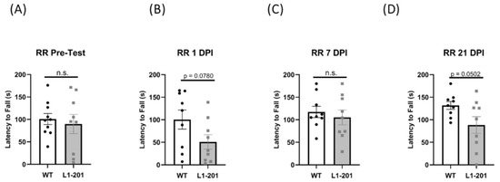2.2. There Is a Trend for Injured L1-201 to Have Impaired Gross Vestibular Motor Function Relative to Injured WT Mice; However, There Is no Significant Difference Seen