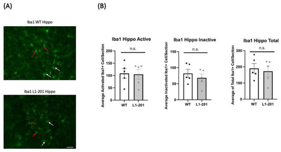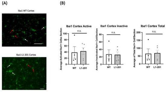 2.3. There Are no Significant Differences in IBA1 between the Injured L1-201 and Injured WT Mice in either the Cortex or Hippocampus at 21 DPI