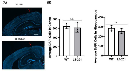 2.6. There Are no Significant Differences in the Number of Cells between the Injured L1-201 and Injured WT Mice in either the Cortex or Hippocampus at 21 DPI