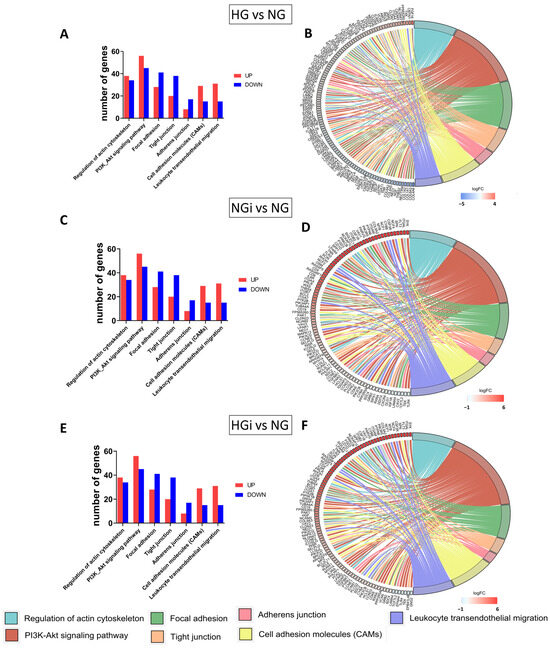 Differentially expressed genes (DEGs) associated with enriched KEGG pathways. DEGs with fold change > 1.2 and padj < 0.05 in VECs under high-glucose conditions (HG) vs. control VECs (NG) (A,B), interacted with monocytes under normal glucose (NGi) vs. NG (C,D) or interacted with monocytes under high-glucose conditions (HGi) vs. NG (E,F) were analyzed. Bar charts and chord plots illustrate the connections between genes and KEGG pathways: Regulation of actin cytoskeleton, PI3K-Akt signaling pathway, focal adhesion, tight junction, adherens junction, cell adhesion molecules (CAMs), and leukocyte transendothelial migration.