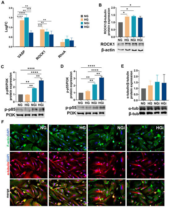 High glucose or interaction of VECs with monocytes modulates VECs cytoskeleton. (A) Gene expression analysis of VASP, ROCK1, and RhoA in VECs in normal (NG) or high glucose (HG) in interaction with monocytes (i). (B) Protein expression of ROCK1 normalized to β-actin protein level; (C,D) the phosphorylation of PI3K subunits p55 and p85 normalized to PI3K protein expression; (E) protein expression of α-tubulin normalized to β-tubulin. (F) The distributions of F-actin fibers (upper panel) and α-tubulin (middle panel) were assessed by immunofluorescence using FITC-phalloidin (for F-actin, green) or a specific primary antibody for α-tubulin and Alexa594-coupled secondary antibody (red) on cultured VEC in normal glucose (NG), high-glucose conditions (HG), or interacted with monocytes in NG (NGi) or HG media (HGi). Nuclei were stained with DAPI (blue). Magnification objective 20×. For graphs in (A–D), n ≥ 3, * p < 0.05, ** p < 0.01, *** p < 0.001, **** p < 0.0001 using two-way ANOVA (A) or one-way ANOVA (B–E).