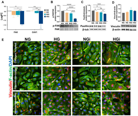 Our data showed that the integrin profile was modified by the interaction of VECs with monocytes and further changed in HG conditions compared to normal glucose. Knowing that integrins form mechanical links between the intracellular actin bundles and the ECM, serving as biochemical signaling hubs at specialized sites of cell–ECM adhesions, named focal adhesions (FAs), we analyzed the adaptor and regulator proteins of these multiprotein complexes. Thus, we examined the gene expression of molecules that regulate the formation or disassembly of focal adhesions, such as FAK (focal adhesion kinase) and caveolin-1. Our data showed that under high-glucose conditions, the gene expression of both FAK and caveolin-1 were significantly decreased in VEC interacted with monocytes (HGi) compared to NG, HG, or NGi VECs (Figure 4A). Moreover, Western blot analysis revealed a significant decrease of FAK protein expression in VECs interacting with monocytes (NGi) with significantly lower levels in VECs interacted under high-glucose conditions (HGi) (Figure 4B).