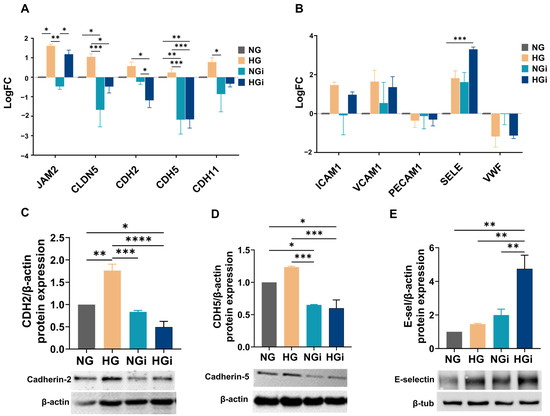 Moreover, the gene expression of cell adhesion molecules ICAM1, VCAM1, PECAM1, E-selectin (SELE), and VWF (von Willebrand factor) was investigated, and only the gene expression of E-selectin was found to be significantly increased in VECs interacted with monocytes in HG conditions (HGi) compared to normal glucose (NG) (Figure 5B).