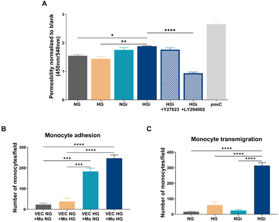 As modifications in the gene and protein expression of various molecules involved in cell–cell communication and cell–matrix interactions were identified, we investigated the functional role of these changes in cellular permeability. Our findings indicate that the endothelial permeability increased when the endothelium was exposed to monocytes in high-glucose conditions (HGi) compared to control VECs (NG) or VECs in HG. Additionally, when employing specific inhibitors for the two kinases found to be activated, namely, Y27623 to inhibit ROCK and LY294002 to inhibit PI3K, we observed the restoration of permeability to control levels only after inhibiting PI3K, but not ROCK (Figure 6A).