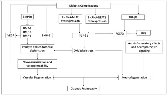 The BMP subfamily is also involved in many mechanisms outside of the vasculature with relevance to DR. BMP2 expression is induced by ROS, which in turn have been previously correlated with hyperglycemia-induced vascular calcification []. Dyslipidemia in diabetes has been shown to increase BMP4, leading to an increase in Nox1, as well as the induction of inflammation by Cox-2 and VCAM-1. BMP2 also releases inflammatory markers to induce adhesion of the endothelium to leukocytes and induces oxidative stress in human retinal endothelial cells (HRECs) [,]. BMP4 has been found to be overexpressed in Muller cells, stimulated by hyperglycemia and reduced by regulatory non-coding RNAs []. This is believed to contribute to DR pathogenesis.