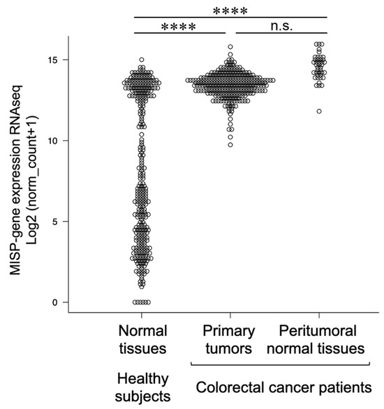 Comparison of the expression of the mitotic spindle positioning (MISP) gene in colorectal tissues. The Cancer Genome Atlas (TCGA) is a cancer genome database. The analysis includes normal tissue samples from healthy subjects (n = 308) and colorectal cancer (CRC) patients (primary tumors, n = 288; peritumoral normal tissues, n = 41). **** p < 0.0001; n.s., no significant difference.