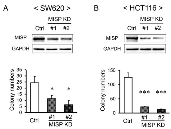 The influence of MISP on cellular proliferation was assessed using a colony formation assay. The suppression of MISP expression (MISP knockdown, KD) led to a significant reduction in both the colony-forming capacity and proliferation rates in human CRC cell lines, SW620 and HCT116 (Figure 2).