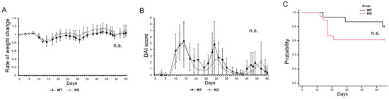 Evaluation of the impact of MISP on chronic inflammation of the colon in the azoxymethane (AOM)/dextran sodium sulfate (DSS) model. (A) Analysis of weight fluctuations. (B) Assessment of Disease Activity Index (DAI) scores. (C) Examination of the survival rate. In panels (A,B), the study included two groups: wild-type (WT, n = 11) and Misp knockout (KO, n = 12). In panel (C), the study involved two groups: WT (n = 15) and Misp KO (n = 18). No significant difference was observed (n.s.).