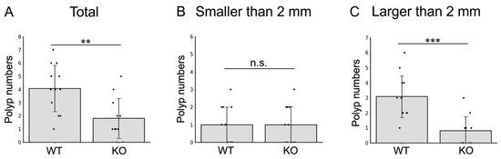Investigation of the effect of MISP on the initiation of colitis-induced colorectal tumorigenesis in the AOM/DSS model. (A) Total number of tumors. (B) Number of tumors smaller than 2 mm. (C) Number of tumors larger than 2 mm. The study included two groups: WT (n = 11) and KO (n = 12). ** p < 0.01; *** p < 0.001; n.s., no significant difference. The number of polyps in each mouse is indicated by the dots.