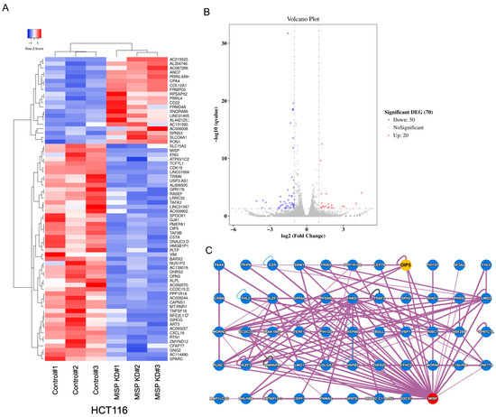 Exploration of MISP-related factors involved in colorectal tumorigenesis through RNA sequencing (RNA-seq) and database analysis. (A,B) Analysis of genes exhibiting significant expression changes in MISP-KD HCT116 cells using RNA-seq, presented as (A) a heat map and (B) a volcano plot. The analysis was conducted with three replicates (n = 3). (C) Exploration of proteins that potentially interact with MISP based on data from the human binary protein interactome database (HuRI).