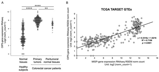 We conducted a correlation analysis on the expression levels of the MISP and OIP5 genes using the UCSC Xena Browser (https://xenabrowser.net, accessed on 1 March 2022). This analysis utilized RNA-seq data obtained from healthy colon tissue samples available in TCGA. Specifically, we utilized the TCGA TARGET GTEx dataset, which can be accessed at https://ocg.cancer.gov/programs/target (accessed on 1 March 2022).