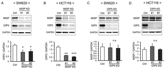 Interrelationship between the expression levels of MISP and OIP5. (A,B) Analysis of changes in OIP5 expression resulting from decreased MISP expression in (A) SW620 and (B) HCT116 cells. (C,D) Investigation of the impact of reduced OIP5 expression on MISP expression levels in (C) SW620 and (D) HCT116 cells. Each set of experiments was conducted with three replicates (n = 3). * p < 0.05; ** p < 0.01; *** p < 0.001; n.s., no significant difference.