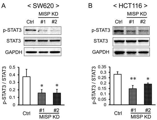 2.8. Reduction in MISP Expression Decreases the Levels of Phosphorylated STAT3 in Colorectal Cancer Cells