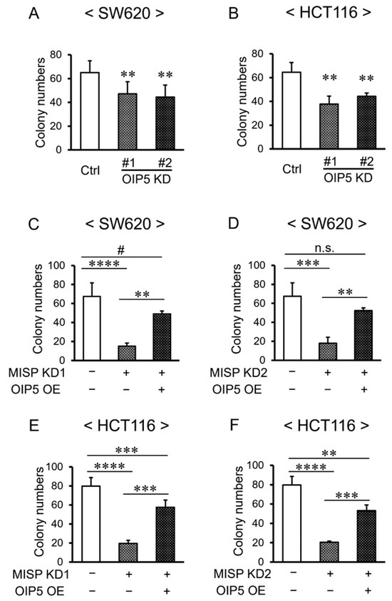 Effect of OIP5 on cell proliferation in human CRC cells. (A,B) Investigation of the effect of reduced OIP5 expression on cell proliferation in (A) SW620 and (B) HCT116 cells. (C–F) Assessment of the impact of OIP5 overexpression on cell proliferation under reduced MISP expression in (C,D) SW620 and (E,F) HCT116 cells. Each experiment was conducted with four replicates (n = 4). # p < 0.1 (indicating a trend); ** p < 0.01; *** p < 0.001; **** p < 0.0001; n.s., no significant difference.