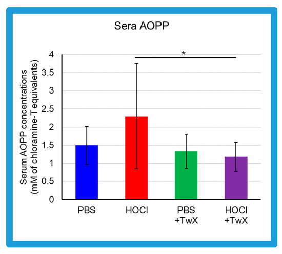 Advanced oxidation protein products (AOPP) in the sera of HOCl-induced SSc mice were elevated compared to the control group treated with PBS (PBS control) (+54% (Not significant)) (Figure 1). On the other hand, in serum of PBS control group and HOCl-induced SSc mice treated with TwX (20 mg/kg/d) (PBS + TwX, HOCl + TwX, respectively), AOPP levels were lower than those of the PBS control group and HOCl-induced SSc mice, respectively (PBS vs. PBS + TwX: −11% (Not significant), HOCl vs. HOCl + TwX: −49% (p < 0.05)) (Figure 1).