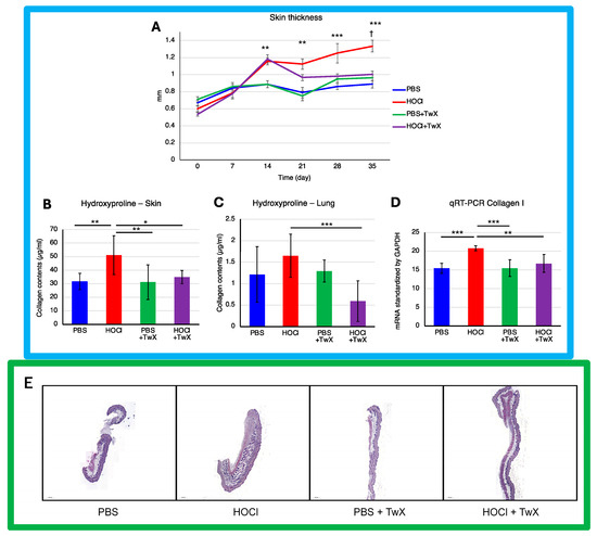 Effect of Twendee X® on fibrosis parameters. (A) Change in skin fold thickness in millimeters from day 1 to day 36, measured weekly (n = 10). **: p < 0.01, ***: p < 0.001 (PBS vs. HOCl), †: p < 0.05 (HOCl vs. HOCl + TwX). (B) Collagen type I levels in skin (mg/punch biopsy) and (C) in lung (mg/lobe biopsy) were evaluated by hydroxyproline dosage. Each box represents mean ± SD from n = 10 individual mice. * p < 0.05; ** p < 0.01; *** p < 0.001. (D) Relative mRNA level of Collagen-1. Results were standardized by GAPDH. Each box represents mean ± SD from n = 10 individual mice. ** p < 0.01; *** p < 0.001. (E) Representative H&E dyed skin sections of 6 μm, showing enhanced fibrosis in mice. Photographs were taken with a Nikon Eclipse 80i microscope (Nikon Instruments, Inc., Melville, NY, USA). Original magnification ×20. The scale represents 500 μm. All data are expressed as the mean ± SD. Kruskal–Wallis test with Dunn’s multiple comparison test was used for all statistical analysis.