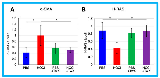 The expression of α-SMA protein was significantly enhanced in HOCl-induced SSc mice (+142% (p < 0.05)) (Figure 3A). However, TwX significantly reduced it to a level similar to that of PBS control mice (−50% (p < 0.05)) (Figure 3A).