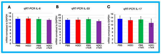 HOCl-induced SSc mice have been reported to exhibit systemic immune cell infiltration and release of inflammatory mediators [57]. In this study, HOCl-induced SSc mice showed a trend towards higher expression of Il-6 and Il-33 mRNA, but the change was not significant compared to PBS-treated mice (IL-6: +1%, IL-33: +1%). Il-17 showed a decreasing trend compared to the PBS-treated mice (−6%), although the difference was not significant. However, TwX treatment decreased Il-6, Il-33, and Il-17 mRNA expression in SSc mice compared to HOCl-induced SSc mice (IL-6: −5% (Not significant), IL-33: −6% (Not significant), IL-17: −12% (Not significant)) (Figure 4A–C).