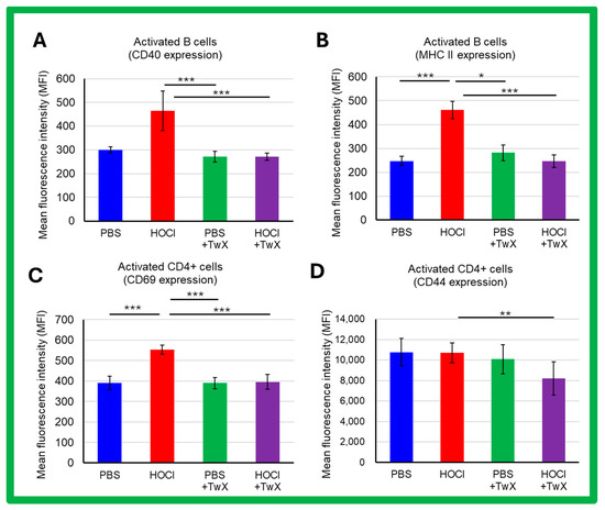 SSc is a systemic autoimmune disease with chronic activation of adaptive immunity by nuclear autoantigens. In HOCl-induced SSc mice, activation of splenic B cells and CD4+ T cells (CD69 expression) was increased compared to PBS control mice (CD40: +55% (Not significant), MHCII: +87% (p < 0.001), CD69: +42% (p < 0.001), CD44: −1% (Not significant)). TwX significantly reduced these activations (CD40: −42% (p < 0.001), MHCII: −47% (p < 0.001), CD69: −29% (p < 0.001), CD44: −23% (p < 0.01)) (Figure 5A–D).