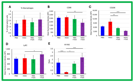 Activated macrophages play a key role in triggering and perpetuating the inflammatory process and in developing fibrosis during SSc. The frequency of splenic macrophages was increased by induction of HOCl (+32% (Not significant)) (Figure 6A). The expression of CD86 and Ly6C showed an increasing trend in macrophages of HOCl-induced SSc mice compared to controls (CD86: +3%, Ly6C: +3%, Not significant) (Figure 6B,D); in the expression of CD206, there was an increase compared to controls (+51% (Not significant)) (Figure 6C). Interestingly, HOCl + TwX mice showed a significant decrease in CD86 and CD206 expression in their splenic macrophages (CD86: −29% (p < 0.01), CD206: −65% (p < 0.001)) (Figure 6B,C), while Ly6C expression was notably increased (+24% (p < 0.05), Figure 6D). In addition, we observed a polarization toward the M2 profibrotic macrophage phenotype (p < 0.001, Figure 6E) in HOCl-induced SSc mice that was reversed in the HOCl + TwX mice (p < 0.001).