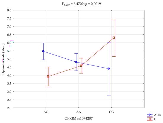 There was a statistically significant interaction effect of the OPRIM rs1074287 genotype and alcohol use disorder subjects or control group on the Openness scale (F2,207 = 6.47 p = 0.0019; η2 = 0.059; Figure 1). The statistical power observed for this interaction of factors was 90%, and approximately 6% (η2) was explained by the OPRIM rs1074287 polymorphism and alcohol use disorder subjects or lack thereof on openness trait score variance.
