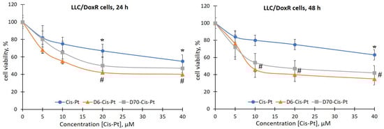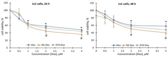 2.2. Viability of LLC Cells under the Action of Water-Soluble Branched D-g-PNIPAM Polymers in Combination with Chemotherapeutic Agents