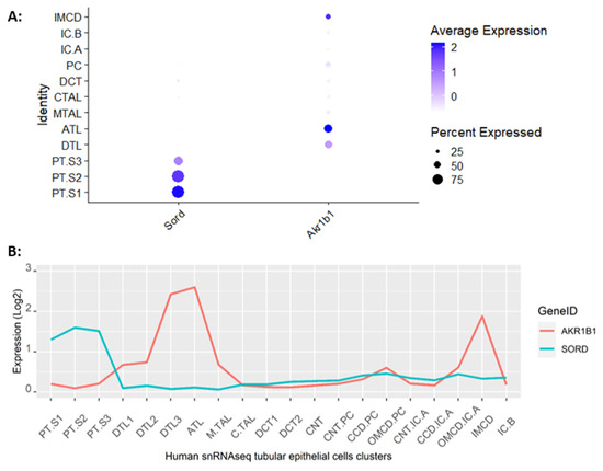 Expression of enzymes from the sorbitol pathway. (A) A dot plot of rat scRNAseq data show that sorbitol dehydrogenase (Sord), which converts sorbitol to fructose, is predominantly expressed in proximal tubules, while aldolase reductase (Akr1b1), which converts glucose to sorbitol, is predominantly expressed in medullary segments. (B) Analysis of human snRNAseq transcriptomes shows that the expression of aldolase reductase (AKR1B1) and sorbitol dehydrogenase (SORD) genes in the human kidney resembles that of the rat.
