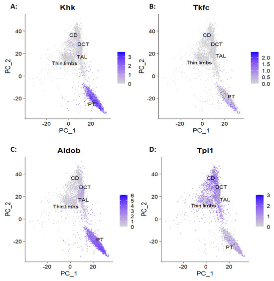 The scRNAseq data presented here were obtained using a balanced experimental design with pools of animals of different ages subjected to either ad libitum or restricted diet regimes [65]. However, this design does not include metabolic conditions that could affect fructose metabolism. For instance, chronic fructose feeding increases the expression of fructose transporters and fructose transport rates in PTs [44]. In addition, hyperglycemic and hypertonic conditions in diabetes are known to stimulate aldolase reductase [66], which given the expression of sorbitol dehydrogenase in PT would increase the flux of fructose into metabolic routes [20,42,43,67]. Given the significance of fructose metabolism in the development of metabolic syndrome and salt-sensitive hypertension, future studies should address these points.