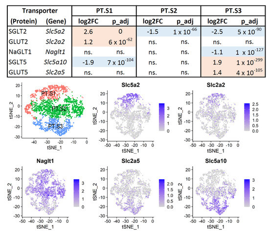Sugar transporters are differentially expressed across proximal tubule cell types. (Upper table) log2 fold change (Log2FC) and p values on each segment, as compared to the other two segments together. (Lower panels) t-distributed stochastic neighbor embedding (tSNE) projections of proximal tubule clusters showing a transcript density map of the differentially expressed sugar transporter in rat proximal tubule scRNAseq clusters. Only differentially expressed sugar transporters are shown in the figure. The tSNE analysis was run in all cells (Appendix A in Figure A1D) and then the clusters corresponding to proximal tubules were extracted for visualization. Proximal tubule cells were not reclustered to create this figure.
