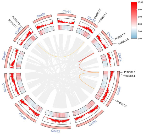 Chromosomal distribution and inter-chromosomal relationship of PbBES1 genes. The outer red bar indicates the Phoebe bournei chromosome, the middle red box indicates the corresponding GC relationship of each chromosome, and the colored line represents the covariance of PbBES1; the gray line indicates the covariance of the whole Phoebe bournei genes.