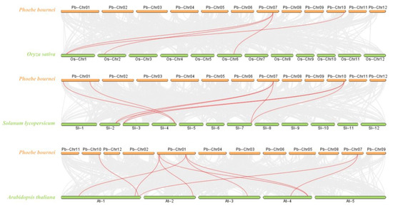 Collinearity analysis plot of Phoebe bournei with Oryza sativa, Solanum lycopersicum, and Arabidopsis thaliana. The red line represents the collinearity comparison of the BES1 gene family, and the gray portion represents the collinearity comparison of the other gene families.