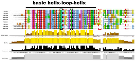 Multiple sequence comparison of PbBES1 protein using Jalview software (v2.11. 3.0). Different amino acids are labeled with different colors, and the possible functional sites or elements are encircled by a box. Black line shows portion of BHLH conserved sequence; black dashed box shows conserved amino-conserved structural domains; red dashed box shows conserved BIN2 phosphorylation binding site.