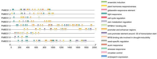 Analysis of cis-acting elements of the PbBES1 gene family, with different colored squares representing different cis-elements; the scale bar at the bottom indicates the position of different cis-elements in the promoter region.