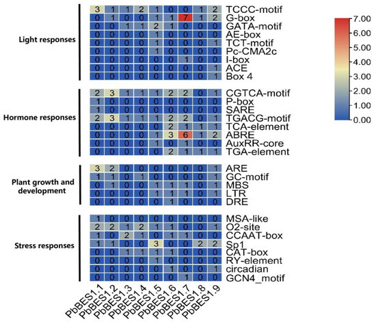 The numbers of the 30 cis-elements of the 9 PbBES1 genes.