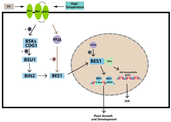 BR mitigates high-temperature stress by enhancing enzymatic and non-enzymatic antioxidant defense and glyoxalase systems [68,69]. EBR, which is a type of BR, significantly improved the survival rate of A. thaliana seedlings when exposed to 43 °C for a period of time [70]. EBR treatment was applied to Ficus concinna seedlings at 40 °C, and the reduced glutathione (GSH) and the ratio of reduced glutathione to oxidative glutathione (GSH/GSSG) of Ficus melisa were significantly increased. EBR treatment reduced 40 °C-induced increases in O2−, H2O2, and MG (Methylglyoxal) levels, and this process was likely associated with a decrease in lipid peroxidation. EBR attenuated the 40 °C-induced oxidative stress by simultaneously increasing non-enzymatic and enzymatic antioxidant responses, as well as MG detoxification systems [67]. Based on the qRT-PCR results, significant differences in the gene expression of the PbBES1 gene environments were observed under high-temperature conditions. Martins et al. demonstrated [71] that BR regulates thousands of genes in roots that are regulated by high temperatures. In addition, in a model that simulates the BR signaling pathway and downstream target genes of BES1 (Figure 10), we found that BES1 was able to bind to the PIF4, which is involved in auxin synthesis, thereby promoting the synthesis of IAA [36]. Therefore, we speculate that PbBES1 promotes auxin synthesis by activating PIF4, thereby alleviating the impact of auxin synthesis and transport at high temperatures and regulating plant growth; however, this needs to be further verified. The expression levels of PbBES1.1~1.5 under high-temperature stress showed that only PbBES1.1 was up-regulated after 24 h of high-temperature treatment, and the expression of the other four genes was down-regulated; thus, PbBES1.1 may be the key gene of the high-temperature stress. Further research, such as that which considers the knockout of PbBES1.1, may provide a more accurate understanding of the function of the gene.