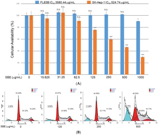 (A) Inhibitory effect of SBE at various concentrations upon FL83B and SK-Hep-1 cell viability as measured by MTT assays. FL83B cells were represented by blue columns, and SK-Hep-1 cells were presented in orange columns. Data are means ± SD of three independent experiments. The statistical results were compared with the control groups (* p < 0.05, *** p < 0.001, n.s. indicated no significance). (B) Sk-Hep-1 cells were treated with 0, 125, 250, and 500 μg/mL SBE and analyzed by flow cytometry. The peak of the apoptotic phase characterized by the increase in the sub-G1 cell fraction (blue color) was observed under treatment of 500 μg/mL SBE while G1 and G2 phases were shown by red color; S phase was indicated by slash area. Ratios of cells in the various phases are represented as a percentage.