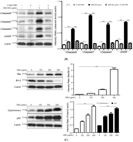 To investigate if this pro-apoptotic effect of SBE is induced by activated forms of key proteins in the apoptotic pathway, we evaluated the levels of caspase-3, caspase-7, caspase-9, and poly-ADP ribose polymerase (PARP) by Western blotting. Cleaved forms of caspase-3 (19 kDa), caspase-7 (20 kDa), caspase-9 (37 kDa), and PARP (89 kDa) were significantly increased under SBE treatment in a dose-dependent manner (Figure 2A). Furthermore, the administration of a pan-caspase inhibitor (z-VAD-FMK) could significantly abolish SBE-mediated apoptosis, which manifested as attenuated cleavage of caspase-3, caspase-7, caspase-9, and PARP (Figure 2B). Tumor suppressor protein p53 is an important regulation factor of apoptosis; therefore, we then surveyed whether p53 also contributes to SBE-induced apoptosis. Bcl-2-associated X (Bax) protein is another pro-apoptotic factor, which increases apoptosis in cells while the B-cell lymphoma 2 (Bcl-2) protein could inhibit programmed cell death and corresponds with the p53 status of the cells. Compared with the control non-SBE-treated cells, those treated with SBE exhibited a dose-dependent decrease in the levels of Bcl-2 expression whereas the levels of p53 and pro-apoptotic Bax protein were correspondingly enhanced with increasing doses of SBE. The ratio of Bax/Bcl-2 protein expression under SBE exposure increased dose-dependently, suggesting the susceptibility of SK-Hep-1 cells toward apoptosis.
