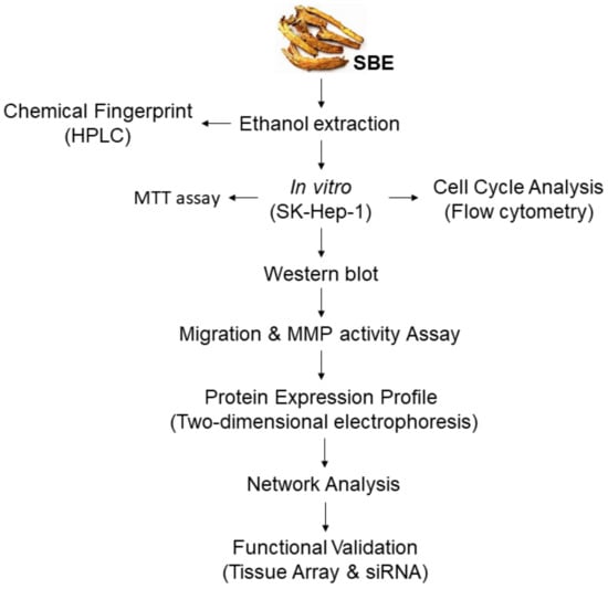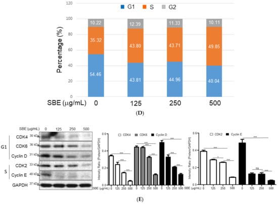 The SK-Hep-1 cells were maintained in DMEM medium containing non-essential amino acid, 10% fetal bovine serum (FBS) at 37 °C in a humidified atmosphere of 5% CO2. FL83B cells were cultured with F12K medium containing 10%. Cell viability was determined by MTT []. A total of 1 × 105 cells were seeded in 24-well plates for 24 h (h) and made quiescent by incubating in medium containing 0.2% FBS overnight. After treating with various concentrations (0, 15.625, 31.25, 62.5, 125, 250, 500, and 1000 μg/mL) of SBE for 24 h, isopropanol solution mixed with tetrazolium salt was added to the wells and incubated for additional 4 h at 37 °C. The optical density of the dissolved material was measured spectrophotometrically at 570 nm, and assays were performed in triplicate. We conducted HPLC analysis for the current batch of SBE and the major components were present in Supplementary Figure S2.