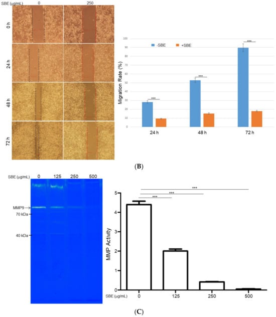 (A) Western blotting was used to determine expressions of EMT associated proteins. The expression of vimentin and N-cadherin was remarkably downregulated while the levels of E-cadherin and claudin were obviously increased under application of SBE. GAPDH was used as an internal control, and the relative expression to GAPDH is represented by the bar graph. Data are means ± SD of three independent experiments (* p < 0.05, *** p < 0.001). (B) SBE administration at 250 μg/mL inhibited wound closure. Representative phase-contrast micrographs of scratch-wounded confluent cultures were recorded at 0, 24, 48, and 72 h post-wounding (*** p < 0.001). (C) A gelatin zymographic assay was performed using SK-Hep-1 cells treated with 0, 125, 250, and 500 μg/mL SBE. The quantitative results are shown as bar charts (*** p < 0.001).